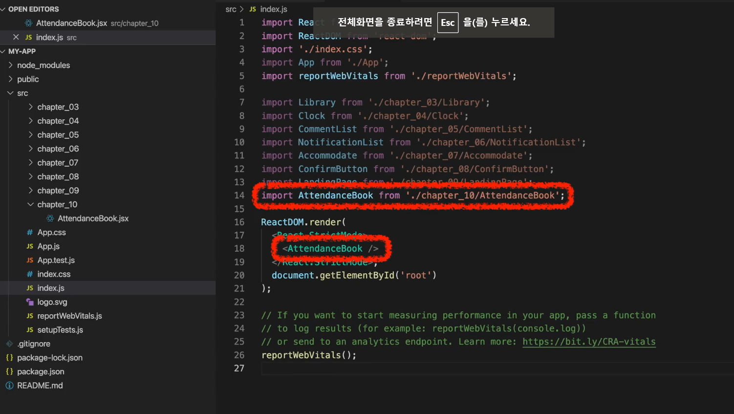 AttendanceBook 컴포넌트를 import해서 ReactDOM.render 함수에 넣어주는 코드