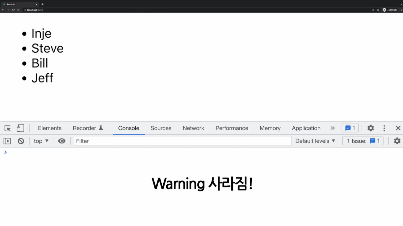 여기서 크롬 개발자 도구의 콘솔 탭에 가보면 경고문구를 확인할 수 있습니다.