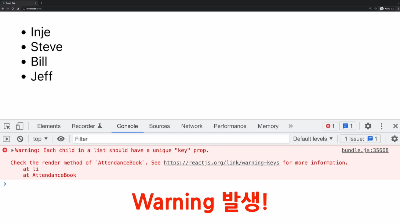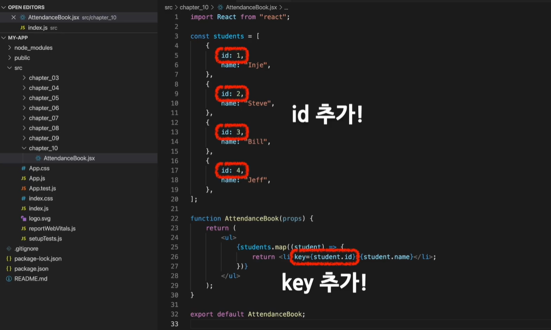 위와 같이 각 학생 개체에 고유한 값인 id를 추가해주고 map() 함수의 element에 id를 값으로해서 key를 넣어줍니다.