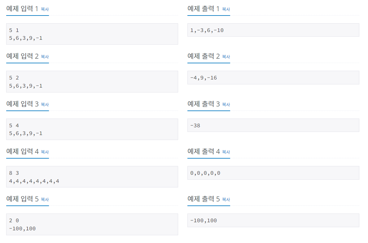 첫째 줄에 수열의 크기 N과 K가 주어진다. N은 20보다 작거나 같은 자연수이고, K는 0보다 크거나 같고, N-1보다 작거나 같은 정수이다. 둘째 줄에는 수열이 ‘,’로 구분되어 주어진다. 수열을 이루