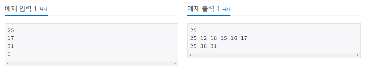 각 입력 줄에 대해 열린 모둔 봉투의 번호의 토끼를 찾을 때까지 열린 봉투의 번호를 순서대로 출력한다. 각 번호는 이전 번호와 공백으로 구분되며, 같은 줄에 있어야 한다.