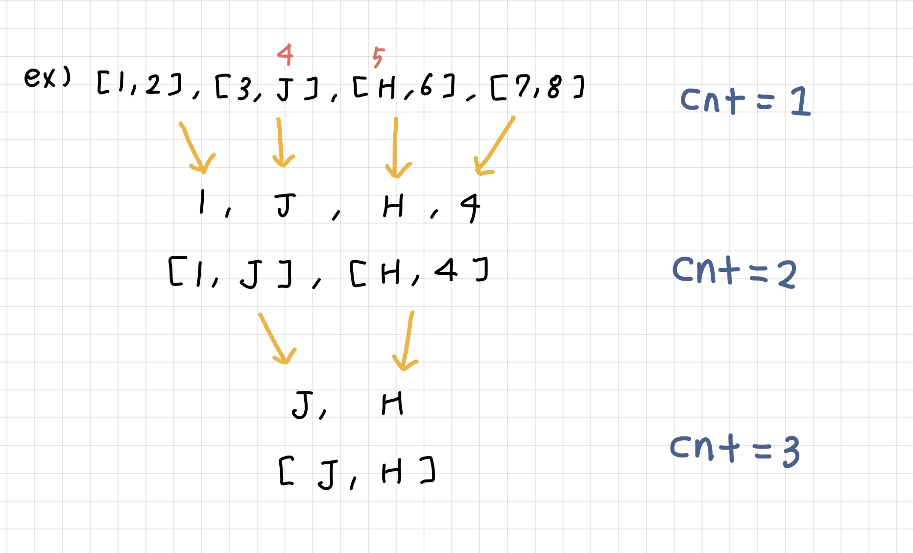 - 주어진 지민, 한수의 번호에 맞는 원소를 J, H로 바꿈 ex) [1, 2, 3, J, 5, H, 7]