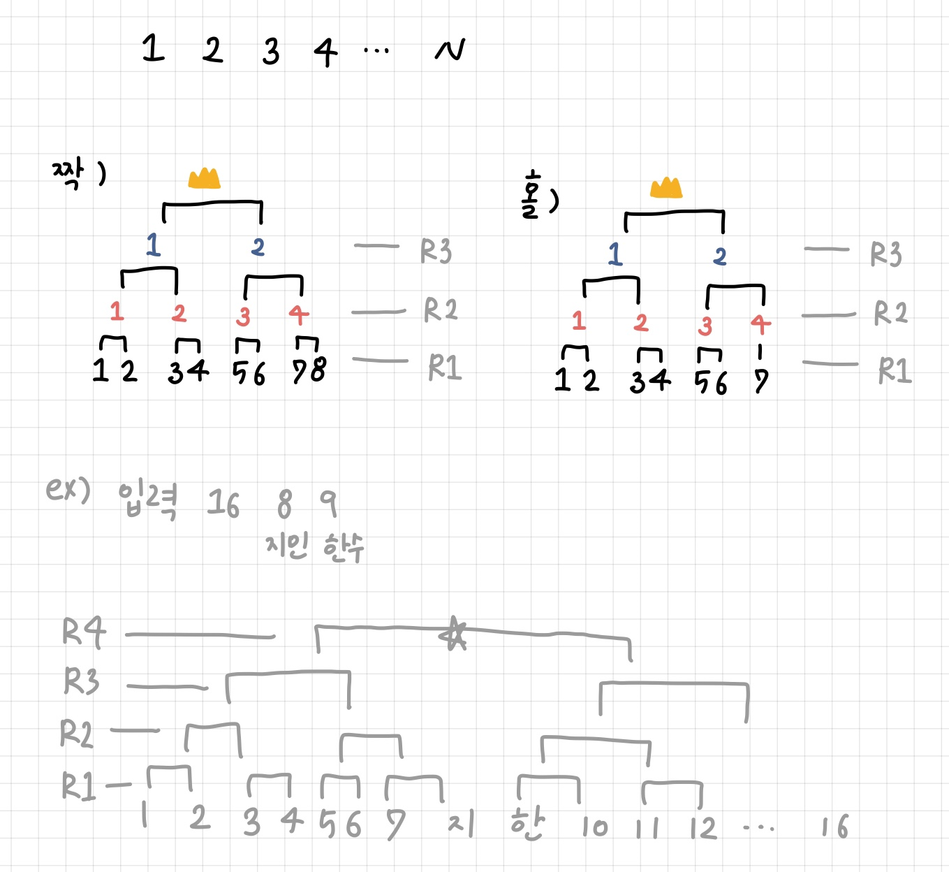 김지민은 N명이 참가하는 스타 토너먼트에 진출했다. 토너먼트는 다음과 같이 진행된다. 일단 N명의 참가자는 번호가 1번부터 N번까지 배정받는다. 그러고 난 후에 서로 인접한 번호끼리 스타를