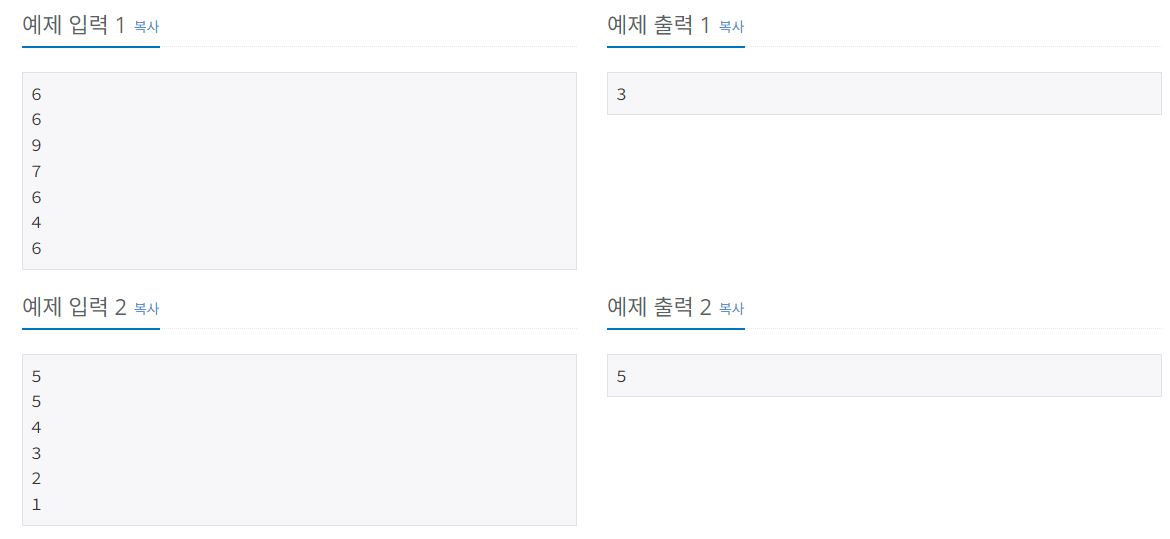 첫 번째 줄에는 막대기의 개수를 나타내는 정수 N (2 ≤ N ≤ 100,000)이 주어지고 이어지는 N줄 각각에는 막대기의 높이를 나타내는 정수 h(1 ≤ h ≤ 100,000)가 주어진다.