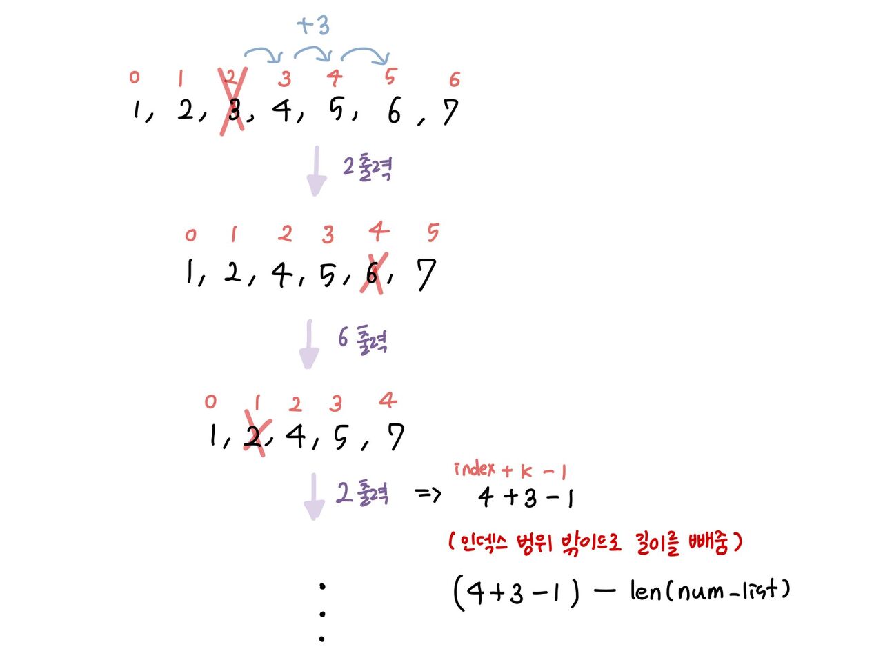 - 그 이후 계속 k-1에서 3번째 이후 사람이 나와야 함 -> 3을 더해줌 & 하나가 제거되었으므로 한 칸씩 당겨야 함 : index 1을 빼주어야 함 => index + k -1 요소를 제거