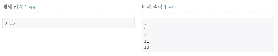 첫째 줄에 자연수 M과 N이 빈 칸을 사이에 두고 주어진다. (1 ≤ M ≤ N ≤ 1,000,000) M이상 N이하의 소수가 하나 이상 있는 입력만 주어진다.