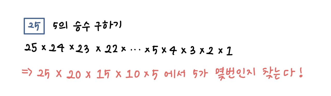 - 5가 들어있는 5의 배수, 25, 20, 15, 10, 5에서 5가 몇 번 나오는지 찾으면 됨