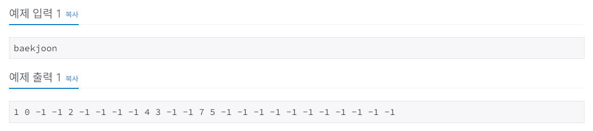 만약, 어떤 알파벳이 단어에 포함되어 있지 않다면 -1을 출력한다. 단어의 첫 번째 글자는 0번째 위치이고, 두 번째 글자는 1번째 위치이다.