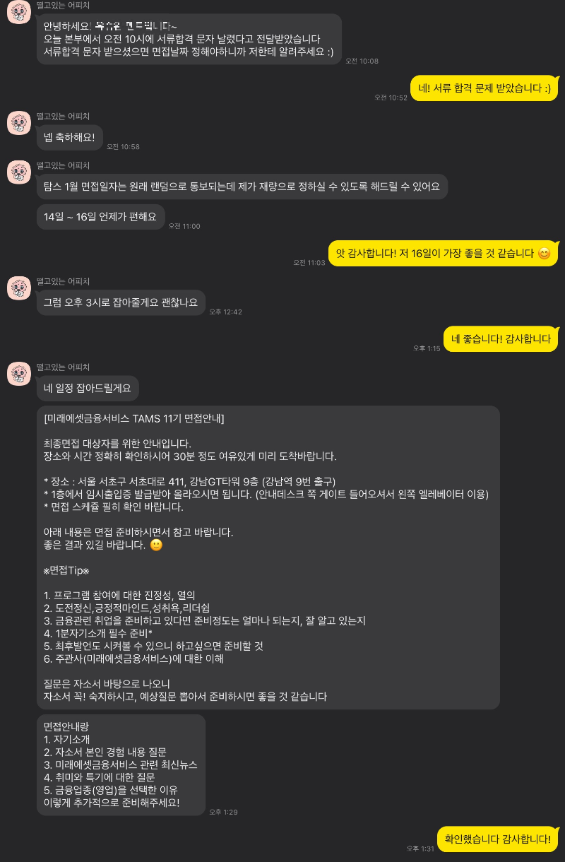 서류 합격 문자를 받고, 멘토님께 간단한 면접 Tip과 설명을 들었습니다!