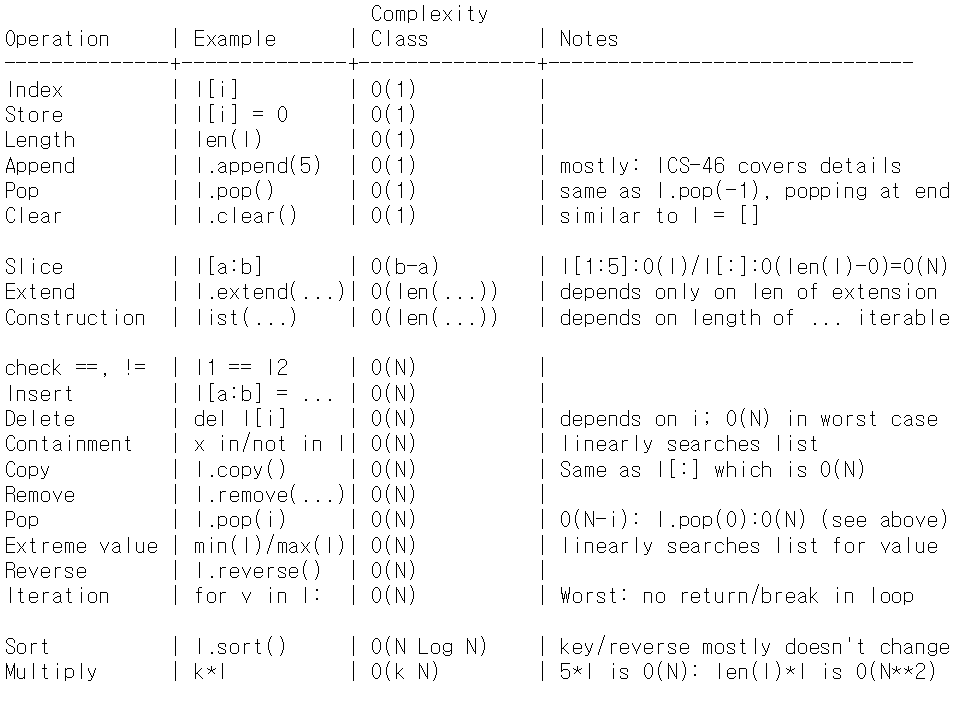 - list 함수는 내부적으로 동적 배열을 사용하여 데이터를 저장하는데, in 연산은 리스트를 처음부터 끝까지 순차적으로 탐색해야 하므로 평균 O(n)의 시간복잡도를 가지게 됩니다