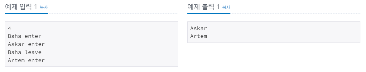첫째 줄에 로그에 기록된 출입 기록의 수 n이 주어진다. (2 ≤ n ≤ 106) 다음 n개의 줄에는 출입 기록이 순서대로 주어지며, 각 사람의 이름이 주어지고 "enter"나 "leave"가 주어진다. "enter"인 경우는
